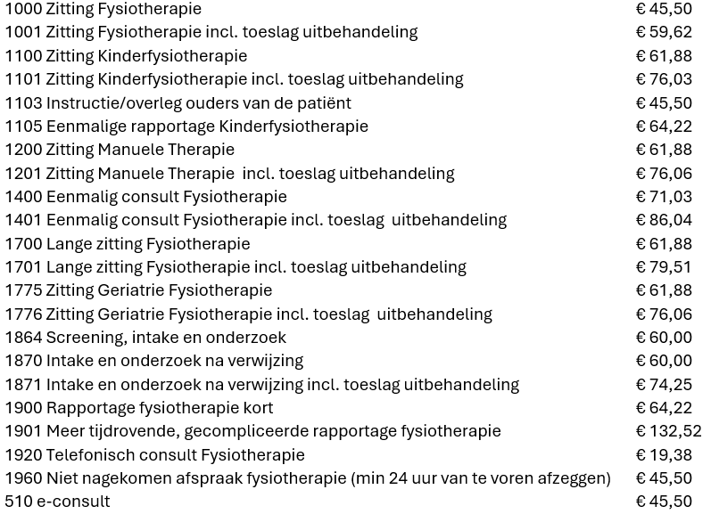 FTC Zuidwolde hanteert de volgende tarieven voor haar behandelingen en overige diensten:
