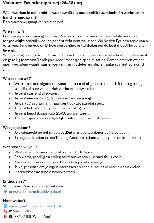 0528 - 371286info@fysiotherapiezuidwolde.nl Online aanmelden